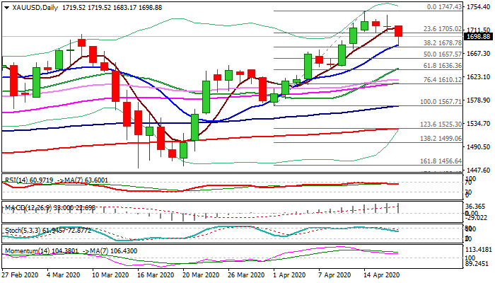 Initial bearish signal could be expected on close below former high ($1703) while clear break of pivotal supports at $1983/78 (10DMA / Fibo 38.2% of $1567/$1747 bull-leg) is needed to confirm and open way for extension of pullback towards $1657 (50% of $1567/$1747).