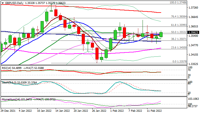 Near-term action remains bullishly aligned above pivotal 1.3500 support zone, where 100DMA keeps the downside protected for two weeks, but bulls need close above cracked daily Tenkan-sen (1.3564) to generate further bullish signal for extension towards next key barriers at 1.3600 (Fibo 61.8% 1.3748/1.3357) and 1.3643 (Feb 10 spike high / near-term range top).