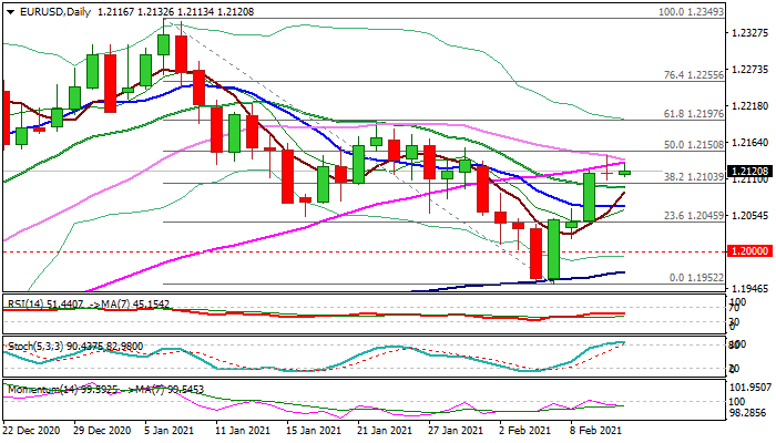 Near-term price action is holding above pivotal supports at 1.2103/1.2096 (broken Fibo 38.2% / 20DMA), close below which would provide initial bearish signal, with return below 10DMA (1.2069) to bring bears in play.