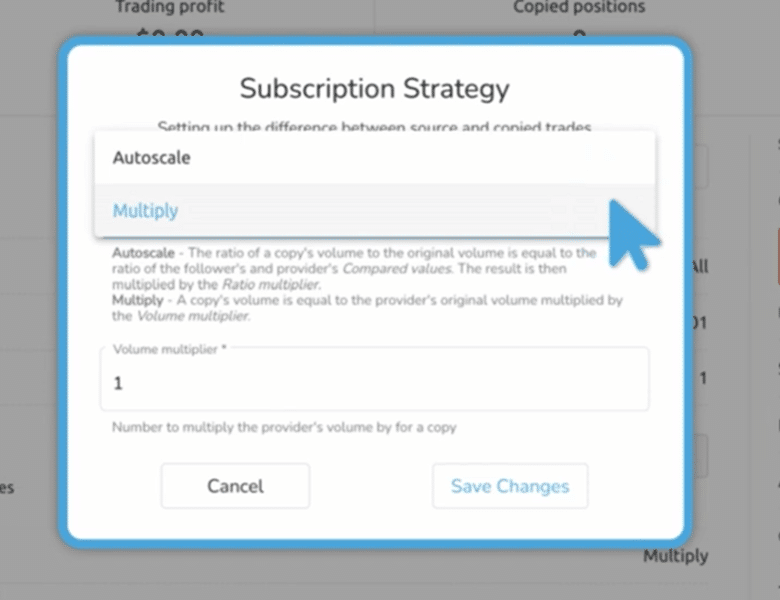 The multiplier option allows traders to directly scale trade volume. For example, a multiplier of 1 means the follower copies the same trade size as the provider (adjusted for account conditions). A multiplier of 0.5 reduces the trade size by half, while a multiplier of 2 doubles it.