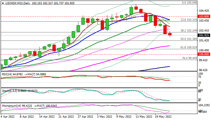 Bears eye next target at 101.38 (50% retracement), with stronger acceleration to risk drop towards strong support at 100.51 (Fibo 61.8% of 97.72/105.04 / top of ascending daily cloud).