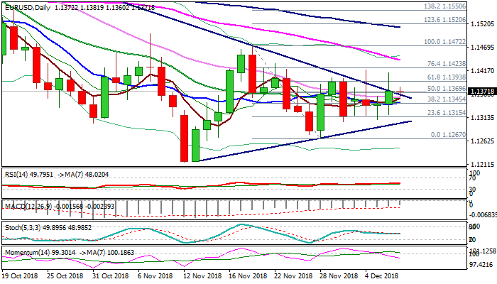 The Euro holds slightly positive tone in early Friday’s trading and moved above trendline resistance (bear-trendline drawn off 1.1815 high, currently at 1.1364).
