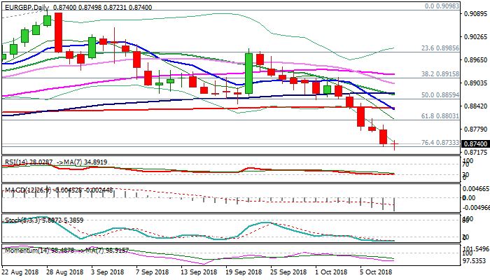 Extension of bear-leg from 0.8988 (24 Sep high) cracked target at 0.8733 (Fibo 76.4% of 0.8620/0.9098 ascend) but without clear break lower so far.