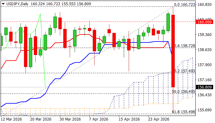 Fresh acceleration hit the levels last traded in late February and marked retracement of near 61.8% of 152.39/160.72 rally, with significant bearish signal seen on surge through ascending and thickening daily Ichimoku cloud (spanned between 157.59 and 155.99).