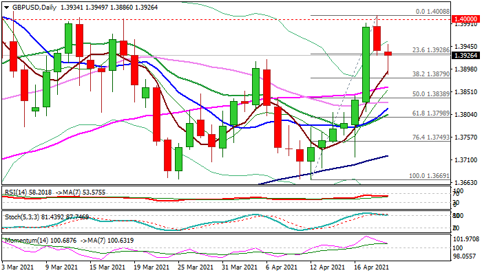 Fresh bears faced headwinds on approach to pivotal Fibo support at 1.3879 (38.2% of 1.3669/1.4008) and bounced back above 1.3900 level.