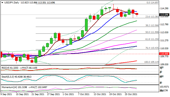 Caution on break below 113.40/10 pivots that would complete a failure swing pattern on daily chart and risk deeper pullback towards next key support at 112.56 (Fibo 38.2% of 109.11/114.69).