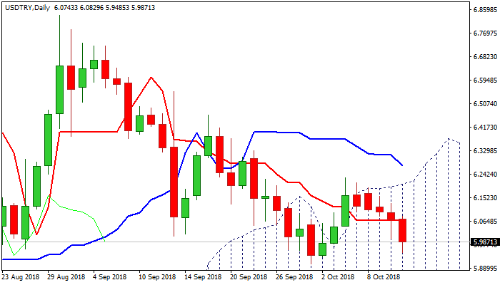 October USDTRY’s low at 5.9053 (lira’s highest since CBRT rate hike in Sep) is in focus and break here would open way towards key points at 5.8097 (daily cloud base) and 5.6875 (16 Aug), the highest of pullback of lira’s pullback from new record low at 7.1074.