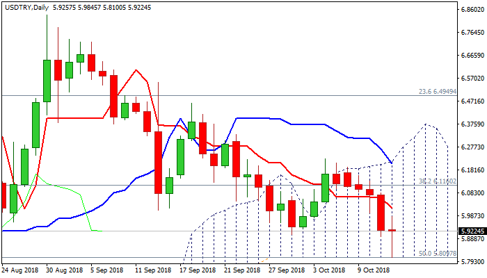 The USDTRY pair holds in the downtrend for over one month, with lira being additionally supported by more radical action of Turkish central bank in September and the pair tested one of key supports at 5.8097 (daily cloud base) which resisted initial attack, but is expected to remain under pressure.