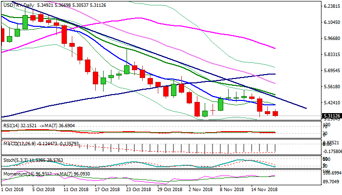 The pair is expected to continue to channel lower on firm break below 5.30 handle, which would open way towards 5.1246 (Fibo 76.4% of 4.5121/7.1074) and 5.1067 (200SMA).