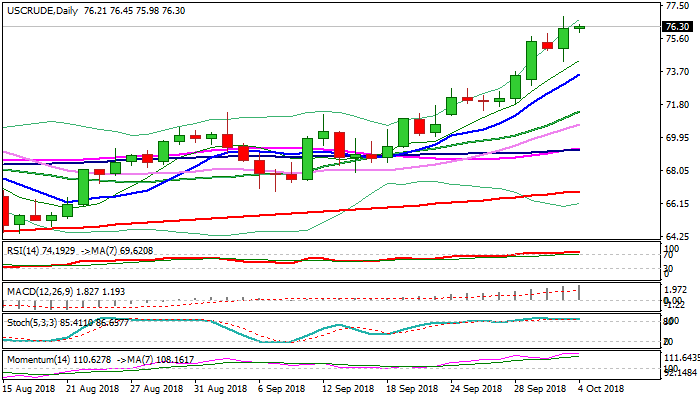 Today’s break above pivotal barriers at $76.35 (Fibo 61.8% of 107.45/$26.04 fall / Fibo 138.2% expansion of the third wave of five-wave cycle from $64.43) was strong bullish signal which needs confirmation on daily close above these barriers.