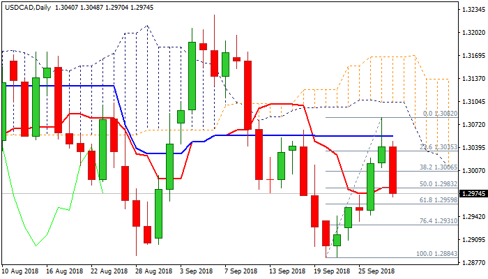 Bears found footstep at 1.2970 (10SMA), ahead of lower pivots at 1.2959 (Fibo 61.8% of 1.2884/1.3082) and 1.2927 (cracked top of weekly cloud), break of which is needed to confirm lower top and re-focus key support at 1.2884 (20 Sep low).