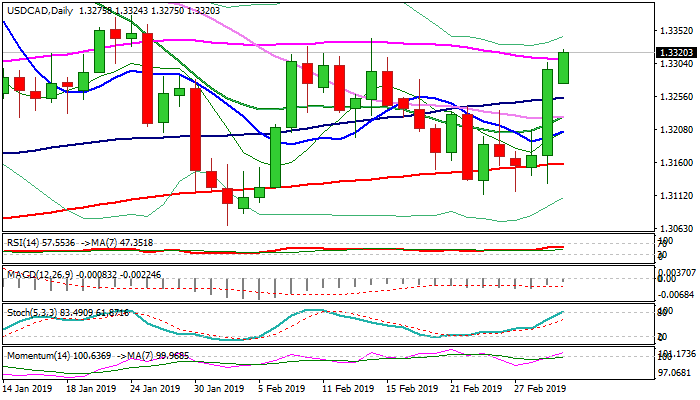 The pair maintains firm bullish tone and extends advance from last Friday (daily gains of nearly 1%) above 1.33 barrier, to threaten retest of 14 Feb recovery high (1.3340) and attack at daily cloud base (1.3355).
