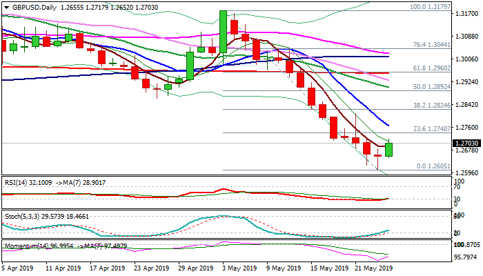 Fresh bulls face initial barrier at 1.2740 (Fibo 23.6% of 1.3179/1.2605) but would feel more comfortable on break and close above falling 10SMA (1.2766) that would open way for test of pivotal barrier at 1.2824 (Fibo 38.2%).