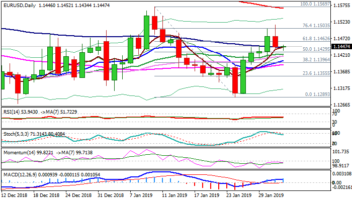 Ability to hold above 1.1429 would keep in play hopes for fresh upside, with eventual weekly close above 20WMA (1.1436) which capped weekly actions since mid-Sep, needed to reinforce positive signal.