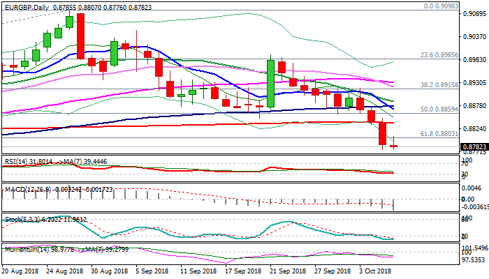 Steep fall in past two week’s when the pair was down 2.1%, with break below weekly cloud and close below pivotal support at 0.8803 (Fibo 61.8% of 0.8620/0.9098 ascend), adds to negative outlook.