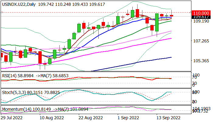 Sustained break of cracked psychological 110 barrier would open way towards Fibo projections at 111.12 and 112.85 initially, but stronger rise cannot be ruled out on Fed’s surprise.