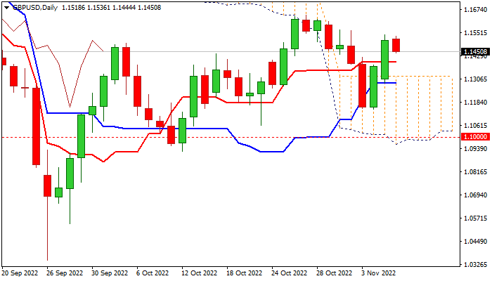 Daily techs, on the other side, are so far bullishly aligned and supportive, but the price action needs to hold above daily Tenkan-sen (1.1395) to maintain bullish bias for renewed attack at 1.15 pivot and possible extension towards key barrier at 1.1645 (Oct 27 high).
