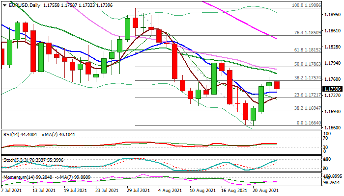The Euro standing at the back foot in early Wednesday’s trading after three-day recovery failed to break pivotal Fibo resistance at 1.1757 (38.2% of 1.1908/1.1664).