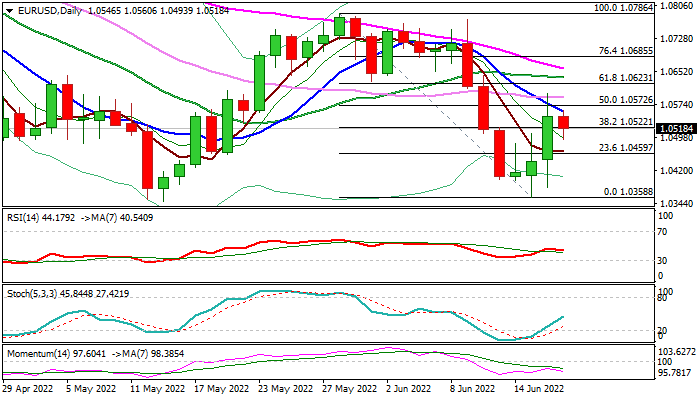 The action remains heavily weighed by daily cloud and bearish studies on daily chart, with Thursday’s bull-trap on Fibo barrier (50% of 1.0786/1.0358) and 10DMA (1.0572) adds to negative signals.