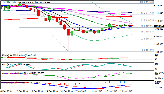 Conversely, initial bullish signal could be expected on break above range ceiling and Fibo barrier at 110.22 (Fibo 61.8% of 113.70/104.59) that would open way towards 200SMA (111.23).