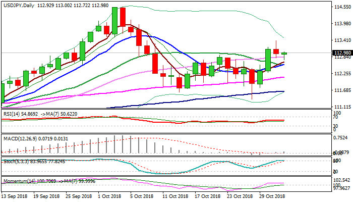 Bears could expect signal on break below converged 10/20SMA’s (112.55), while break and close above cracked 113.33 barrier (Fibo 61.8% of 114.54/111.37 descend) would signal continuation of near-term upleg from 111.37 (26 Oct low).