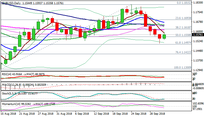Falling 55SMA marks first strong resistance at 1.1611, with extended upticks expected to be capped at 1.1650 zone (converged 100/30/20 SMA), to keep bears in play.