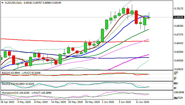 Today’s action stalled at weekly cloud top (0.6969) and subsequent dip found support found footstep at 0.6900 zone, keeping the near-term bias with bulls after Monday’s rally completed reversal pattern on daily chart and signaled that shallow correction is over.