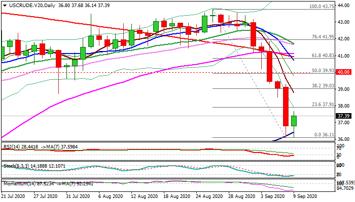 WTI oil bounces on Wednesday after steep fall in past five days (down 14.3%) found footstep at strong technical supports provided by daily cloud base ($36.80) and rising 100DMA ($36.43).