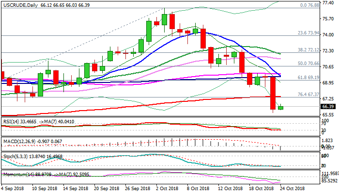 Another rise in crude inventories would further pressure oil prices and risk final push towards key support at $64.43 (16 Aug low / top of rising weekly cloud) as recent fall from $76.88 (03 Oct peak / near four-year high) retraced the largest part of $64.41/$76.88 rally in nearly 14% dip.