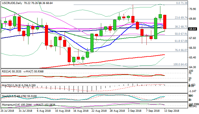 Bears look for extension and close below 30SMA ($68.00) to open way towards $66.85 (07 Sep trough), break of which is needed to confirm double-top and stretch towards rising 200SMA ($65.73).