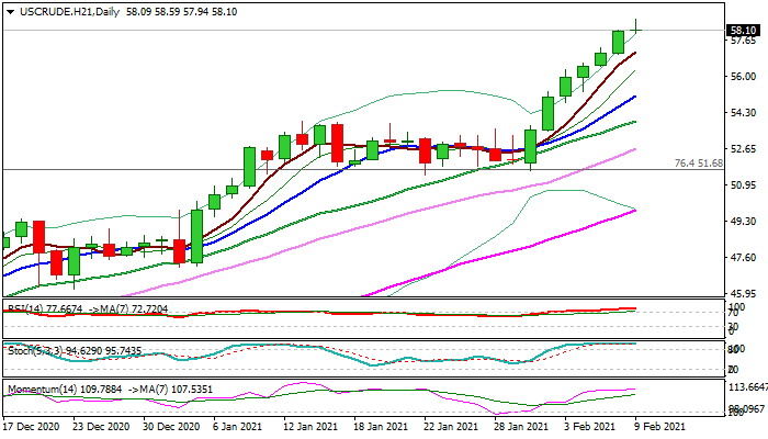 Bullish daily studies underpin the action, also attracted by monthly cloud twist ($59.54) but strongly overbought RSI and Stochastic warn that bulls may position before attack at psychological $60 barrier.