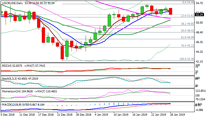 Oil price dipped to $52.42 on Monday after hitting $53.62 high on opening in Asia, probing below initial support at ($52.92) that exposes solid supports at $51.38/09 (converging 55/20SMA’s).