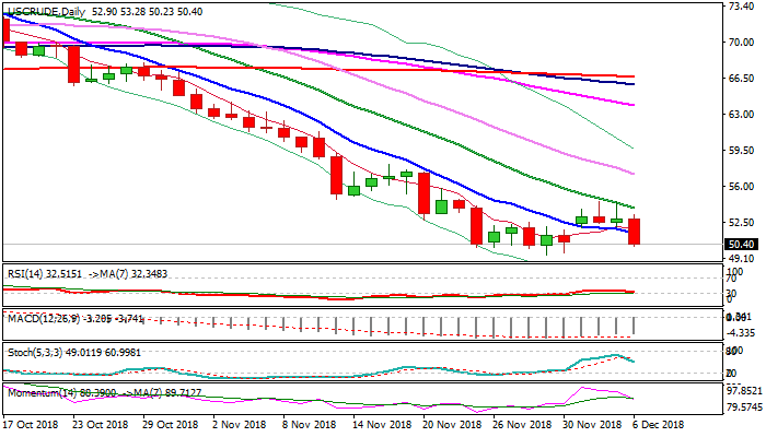 Sustained break below $50 pivot would signal continuation of larger downtrend (oil price was down 34% since early Oct) which could extend towards Fibo support at $45.46 (61.8% of $26.04/$76.88 ascend).