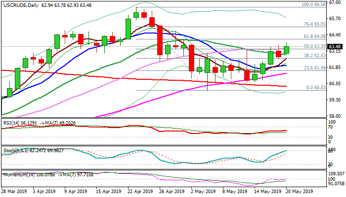 WTI oil opened with 25 pips gap higher on Monday and rallied to the highest level ($63.78) since 1 May, boosted by rising tensions in Persian Gulf and signals that OPEC+ group would probably maintain production cut.