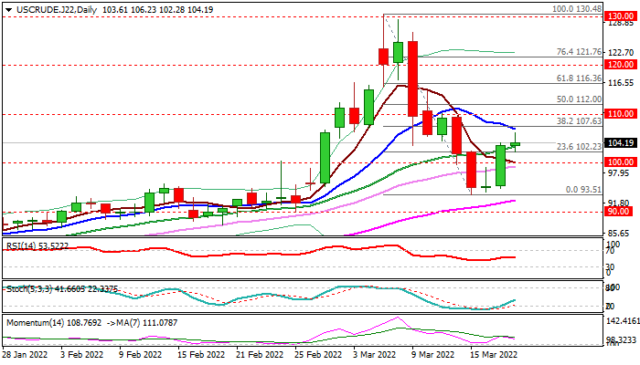 WTI oil returned above $100, after dipping to $93.51 earlier this week and is likely to close above this level that would generate initial positive signal, in addition formation of reversal pattern on daily chart. Although recovery picked up, it still needs more work at the upside to generate firmer reversal signal, with lift and close above pivot at 107.63 (Fibo 38.2% of $130.48/$93.51) needed to confirm.