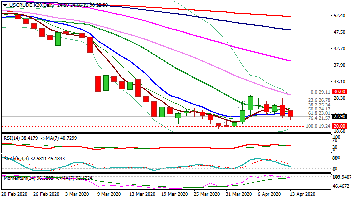 Oil price is in downtrend since recovery rally on renewed optimism stalled at $29.11 and fresh weakness retraced slightly over 61.8% of $19.24/$29.11 recovery leg, but was so far unable to clearly break below pivotal support at $23.01 (Fibo 61.8) following four unsuccessful attempts.
