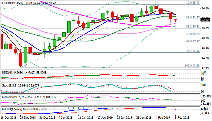 Oil remains at the back foot following double-failure at pivotal $55.55 Fibo barrier (38.2% retracement of $76.88/$42.36 descend), with negative sentiment being boosted by growing worries about global economic slowdown that offsets positive impact from OPEC-led production cut.