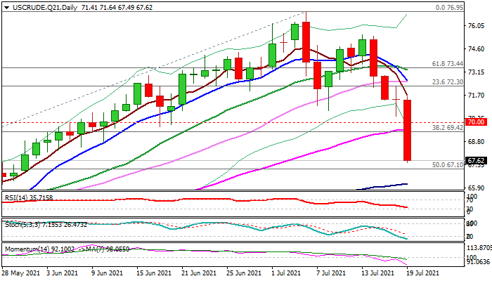 Fresh weakness generated bearish signal on surge through psychological $70 level and pivotal Fibo support at $69.42 (38.2% of $57.25/$76.95).