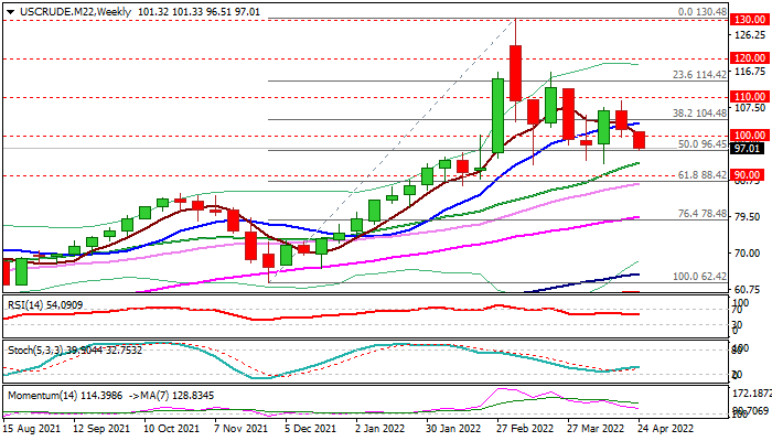 Fresh drop weakens daily studies, with initial negative signal expected on close below $100 and next on sustained break below dented Fibo support at $96.45 (50% of $62.42/$130.48 upleg) that would expose key higher base at $96.90/$96.60 zone, loss of which would confirm reversal and signal deeper drop of oil price.