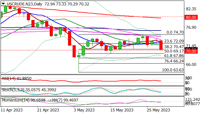 Fresh acceleration lower dented pivotal Fibo support at $70.47 (38.2% retracement of $63.63/$74.70 advance) with daily close below here to generate new signal and expose next pivotal supports at $70 and $69.17 (psychological / 50% retracement of $63.63/$74.70 ($69.17).