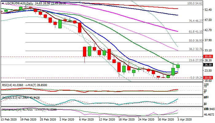 Today’s close above 20DMA would generate bullish signal for attempts towards next significant obstacles -psychological $30 level and $32.76 (Fibo 38.2% of $54.62/$19.24 descend)