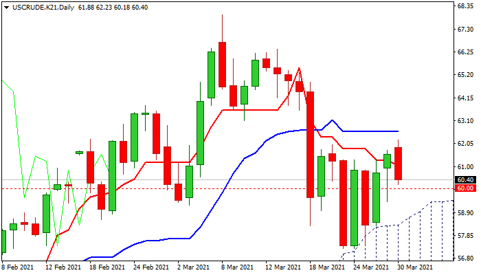 Fresh weakness following recovery stall pressures psychological $60 support, with extended dips to find footstep above the top of rising daily cloud (spanned between $58.68 and $54.23, which contained previous dips and offers solid support) and keep bulls in play.