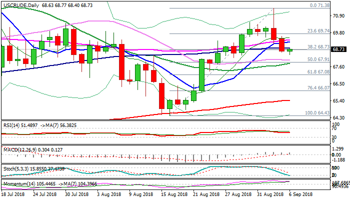 WTI oil is holding within tight consolidation in early Thursday’s trading after strong two-day fall. Oil prices came under pressure on increasing turbulence in emerging markets and concerns about the trade conflict between the US and China, but stronger negative impact was offset by supply concerns over sanctions on Iran and unexpected draw in US crude stocks (API report showed 1.2 million barrels draw vs previous week’s build of 0.03 million barrels.