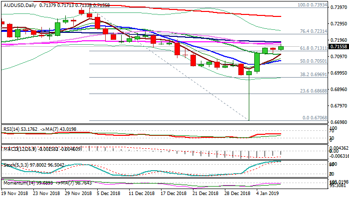 Strong bullish sentiment offset negative impact from downbeat Australian data (building approvals Nov -9.1% vs -0.3% f/c), as the pair cracked the lower boundary of strong resistance zone between 0.7164 and 0.7183, consisting of a cluster of daily MA’s and the base of daily cloud.