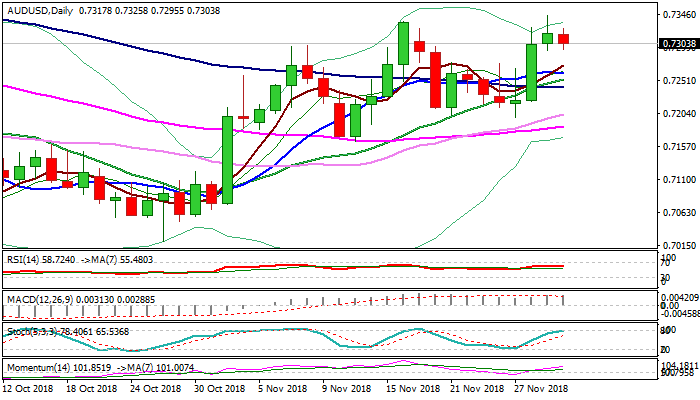 Long upper shadow on Thursday’s daily candle signal upside rejection which could result in further easing, as traders booked profits after rally failed to resume on initial attempt through 0.7335 pivot and weaker than expected China’s PMI data added to negative near-term tone.