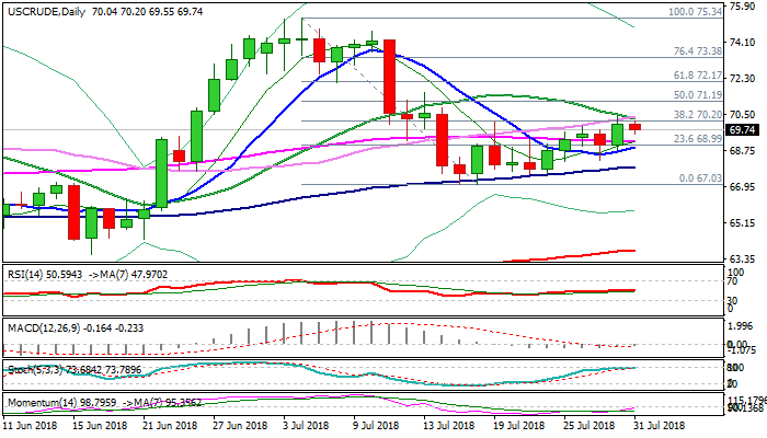 However, pullback was so far limited and bullish bias is expected to remain in play while broken 55SMA ($69.17) holds, but repeated failure at key $70.20 barrier (Fibo 38.2% of $75.34/$67.03) could be a negative signal.