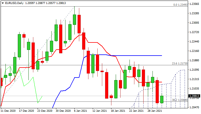 Bearish acceleration also managed to register a marginal close below pivotal Fibo support at 1.2064 (38.2% of 1.1602/1.2349) on Monday, but so far stays above the last pivot at 1.2053 (Jan 18 low).