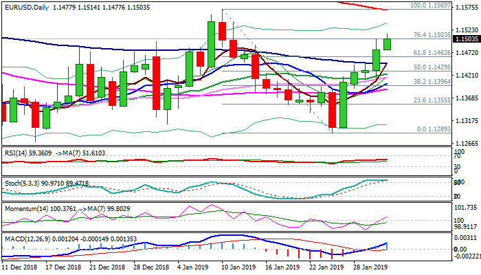 The Euro maintains bullish tone on Thursday morning and extended strong advance of the previous day, sparked by dovish Fed, to crack Fibo barrier at 1.1503 (76.4% of 1.1569/1.1289 descend) and post new three-week high at 1.1514.