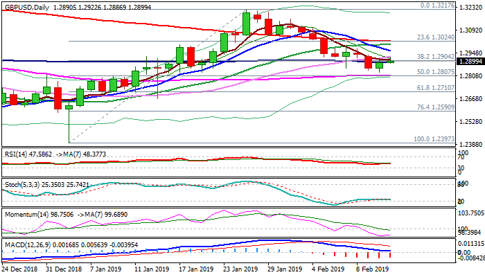 The pair extends recovery despite previous day’s close below 100SMA (1.2889), with upticks so far seen as positioning for fresh weakness as situation over Brexit – pounds key driver – remains unclear and so far signaling that divorce without deal could be likely scenario.