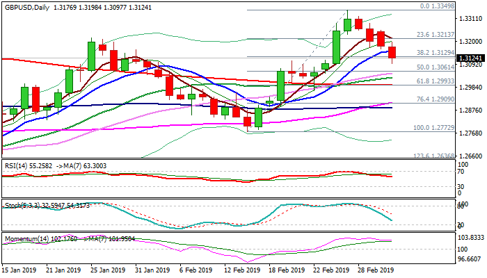 Fresh bearish acceleration keeps the pair firmly in red for the fourth straight day and broke through key supports at 1.3154 (10SMA) and 1.3129 (Fibo 38.2% of 1.2772/1.3349).